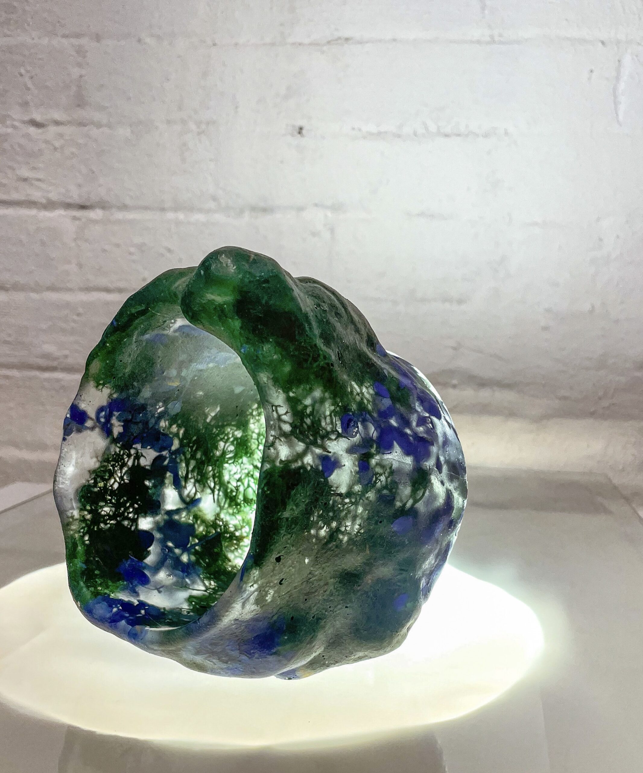 Cast in translucent resin, the vessel encapsulates dried and dyed plant fragments, suspended within the material like geological inclusions or frozen botanical traces. Light penetrates the object, revealing depth, colour variation and internal textures.
